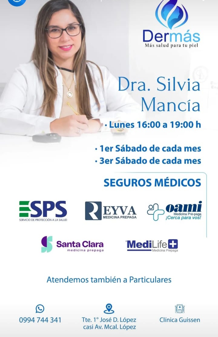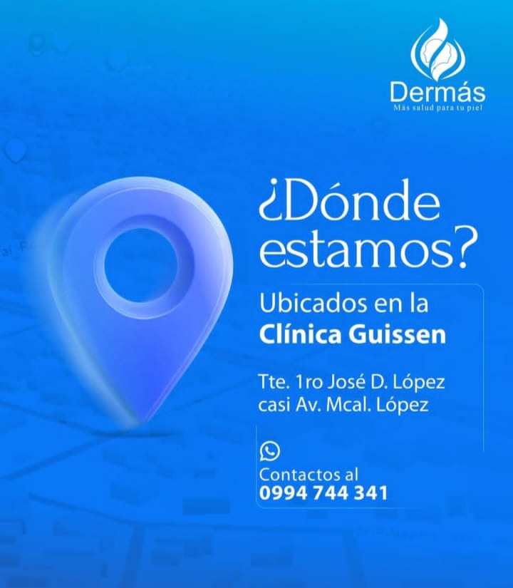 Miércoles de 09:30 a 11:30 hs. Viernes de 14:00 a 16:00 hs. / Dermás - Clínica Guissen Lunes de 17:00 a 19:00 hs. Agendamiento/ 0994744341